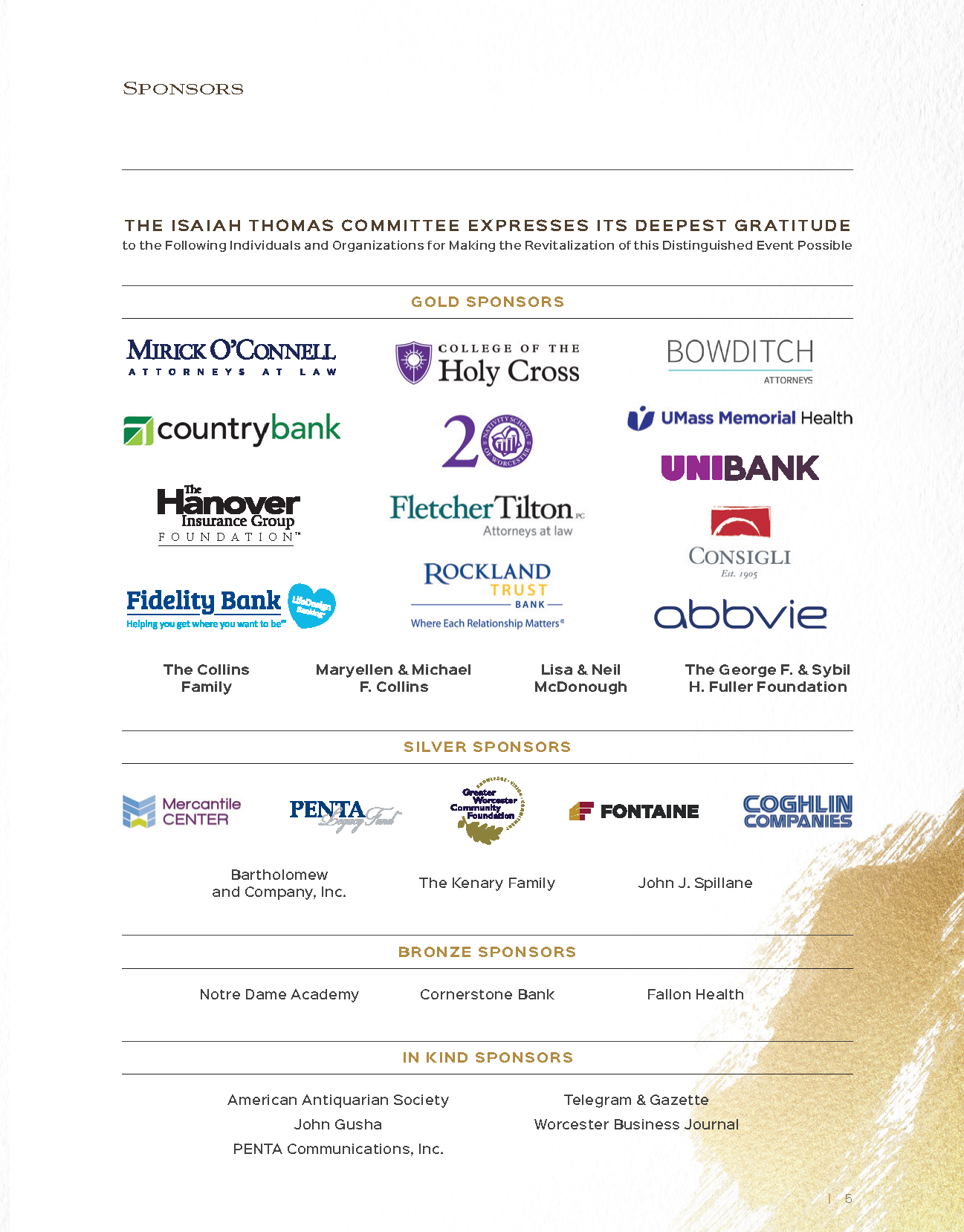 Among the pages of Worcester history, one name, more than any other, stands out as best exemplifying community spirit – the name of Isaiah Thomas. He was a man of many accomplishments, who was a printer, publisher, businessman and philanthropist. He did much to promote the betterment of Worcester in its early days. It is appropriate therefore, that his name should be selected as the inspiration for this Award.